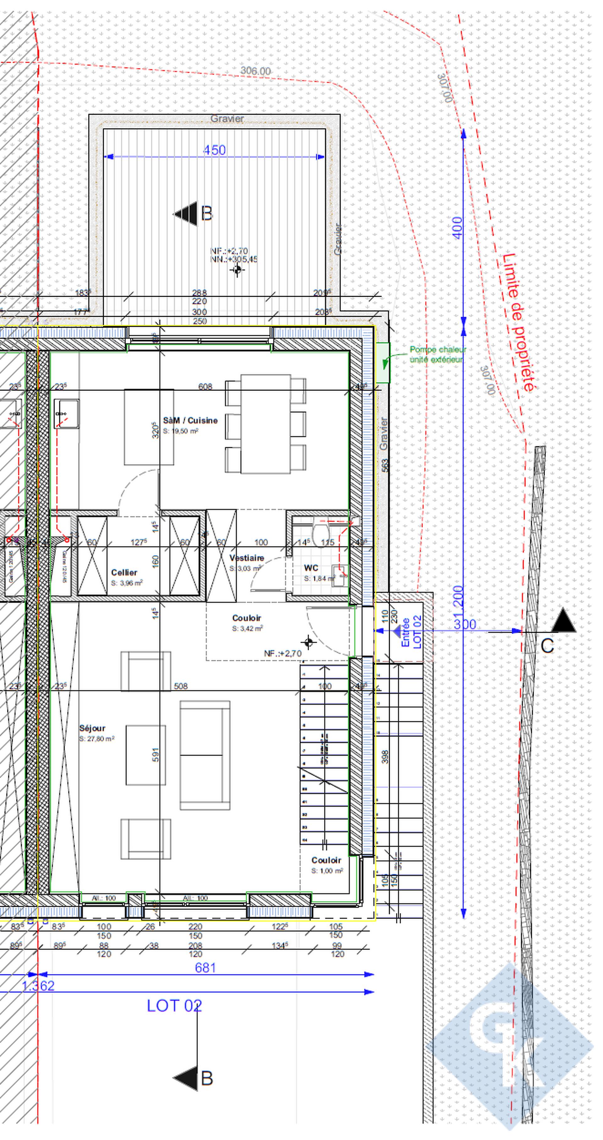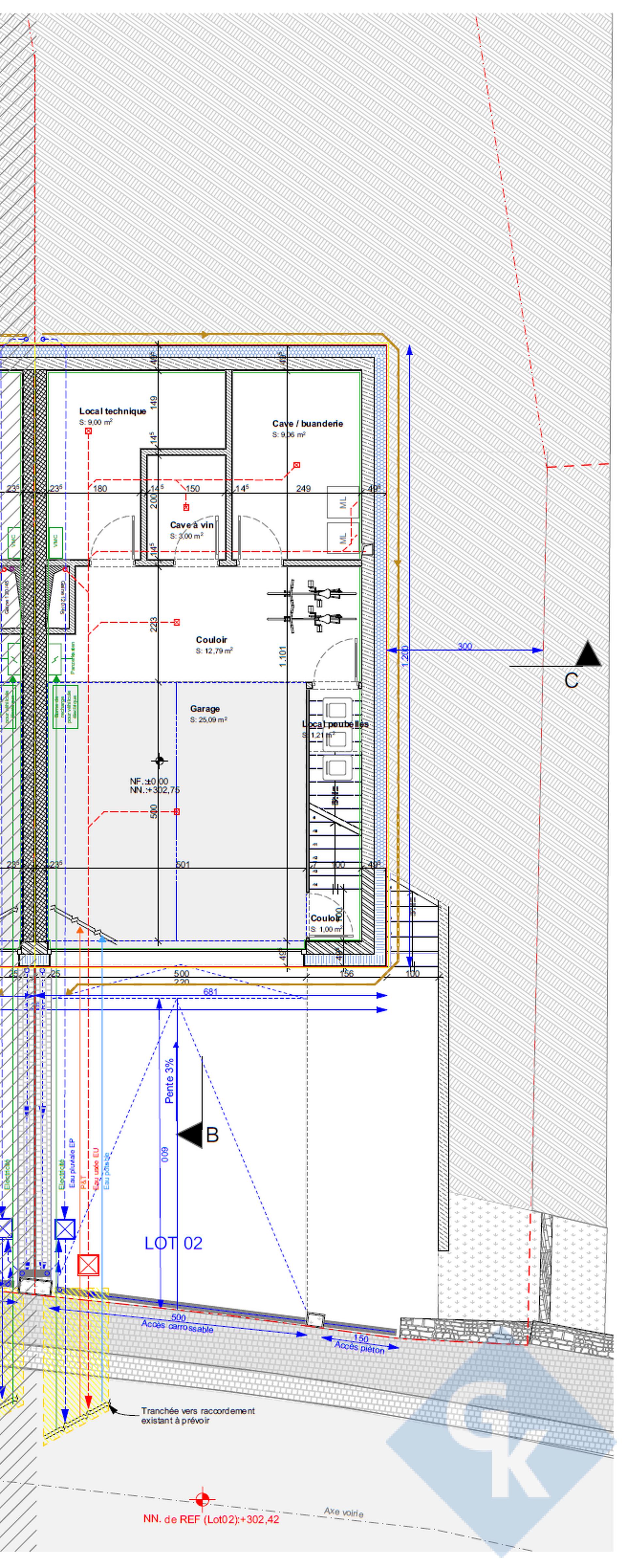 Au RDCH : garage pour 2 voitures (25,09 m²) ; couloir (12,79 m²) ; cave/buanderie (9,06 m²) ; cave à vin (3,00 m²) ; local technique (9,00 m²) ; local poubelles (1,21 m²) ; 2 parkings extérieurs.