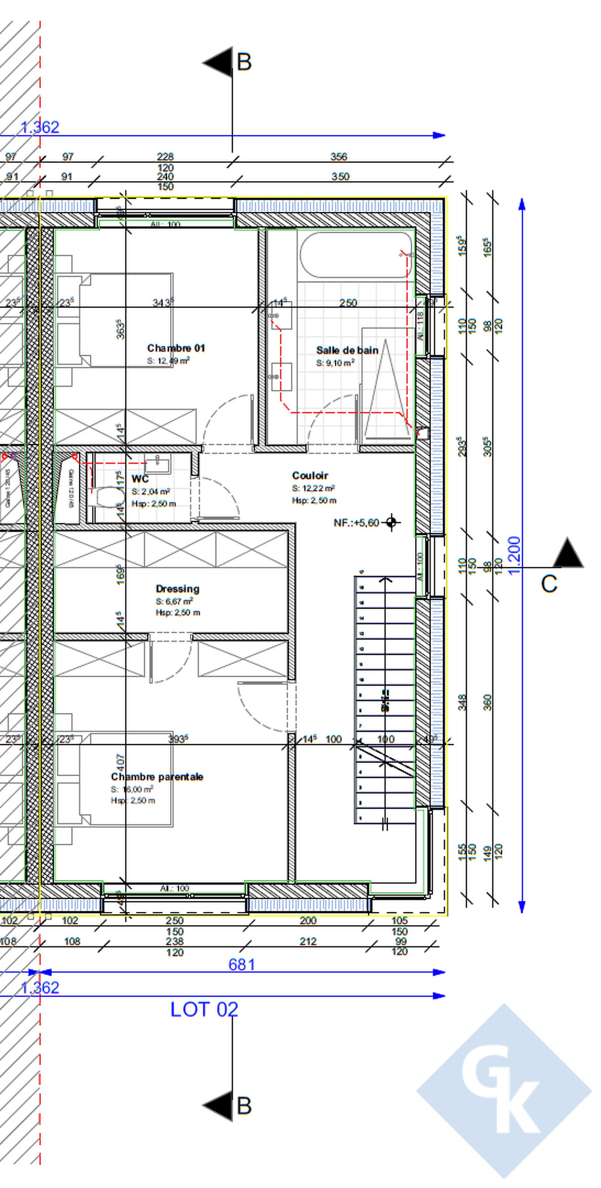 2ième étage : hall de nuit (12,22 m²) ; salle de bain (9,09 m²) ; chambre 1 (12,49 m²) ; WC séparé (2,04 m²) ; chambre 2 (16,00 m²) avec dressing (6,67m²).