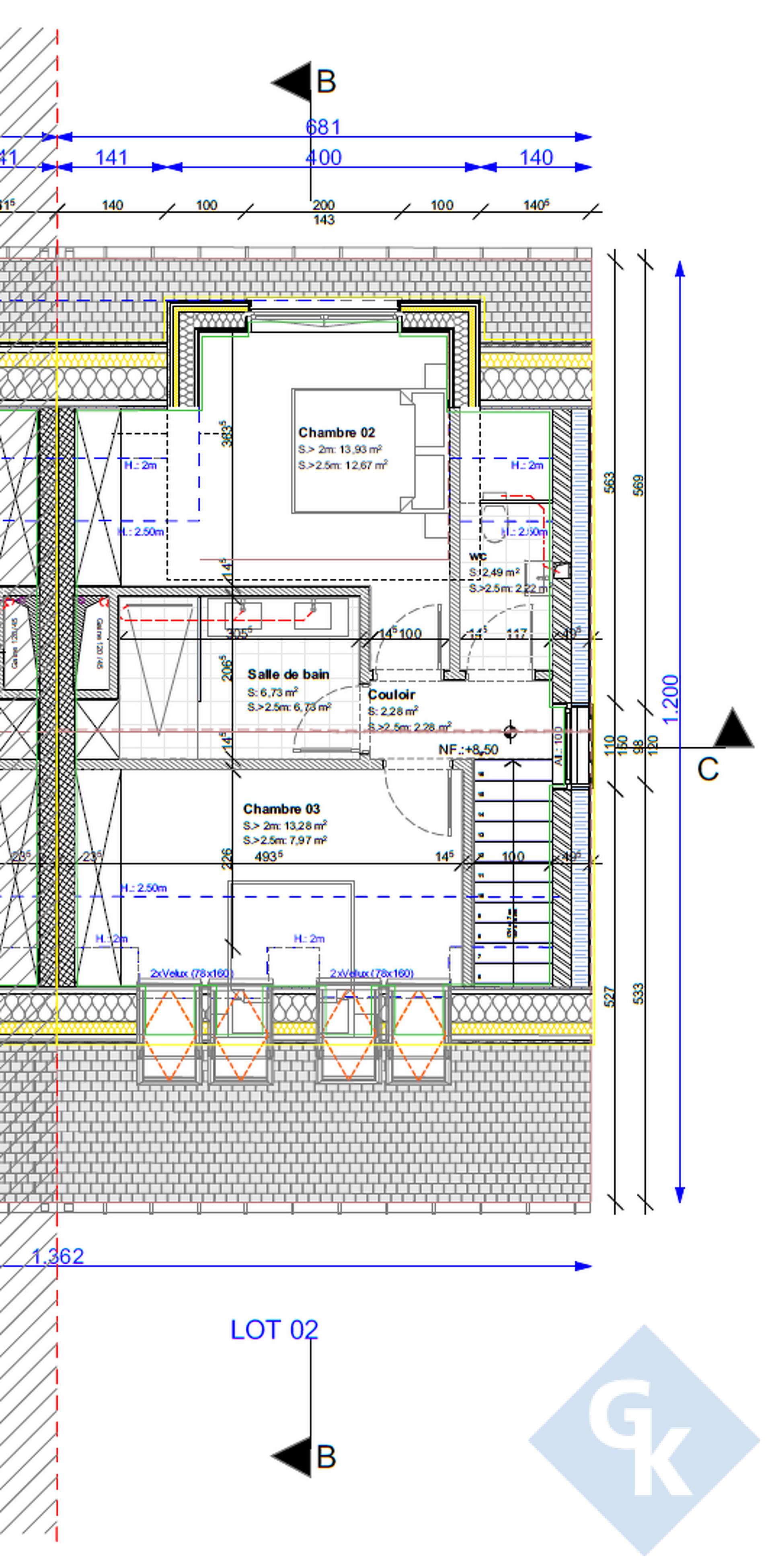 3ième étage : hall de nuit (2,28 m²) ; chambre 3 (13,93 m²) ; chambre 4 (13,28 m²) ; salle de bain (6,73 m²) ; WC séparé (2,49 m²)