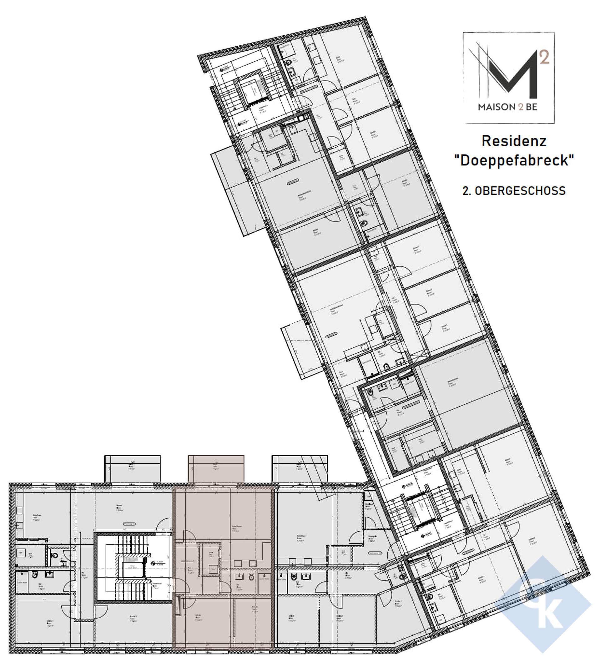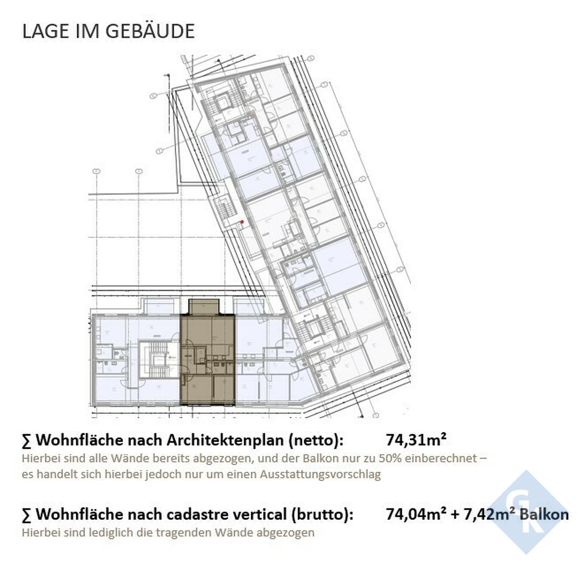 Composition de l'appartement au 2ème étage Lot 112 app n°11 de 74.04 m² brute avec un balcon de 7.42 m² et une cave de 5.28 m² au sous-sol selon le cadastre vertical et de 74.31 m² selon le plan de l'architecte (tous les murs ont déjà été retirés et le balcon n'est inclus qu'à 50 %) :