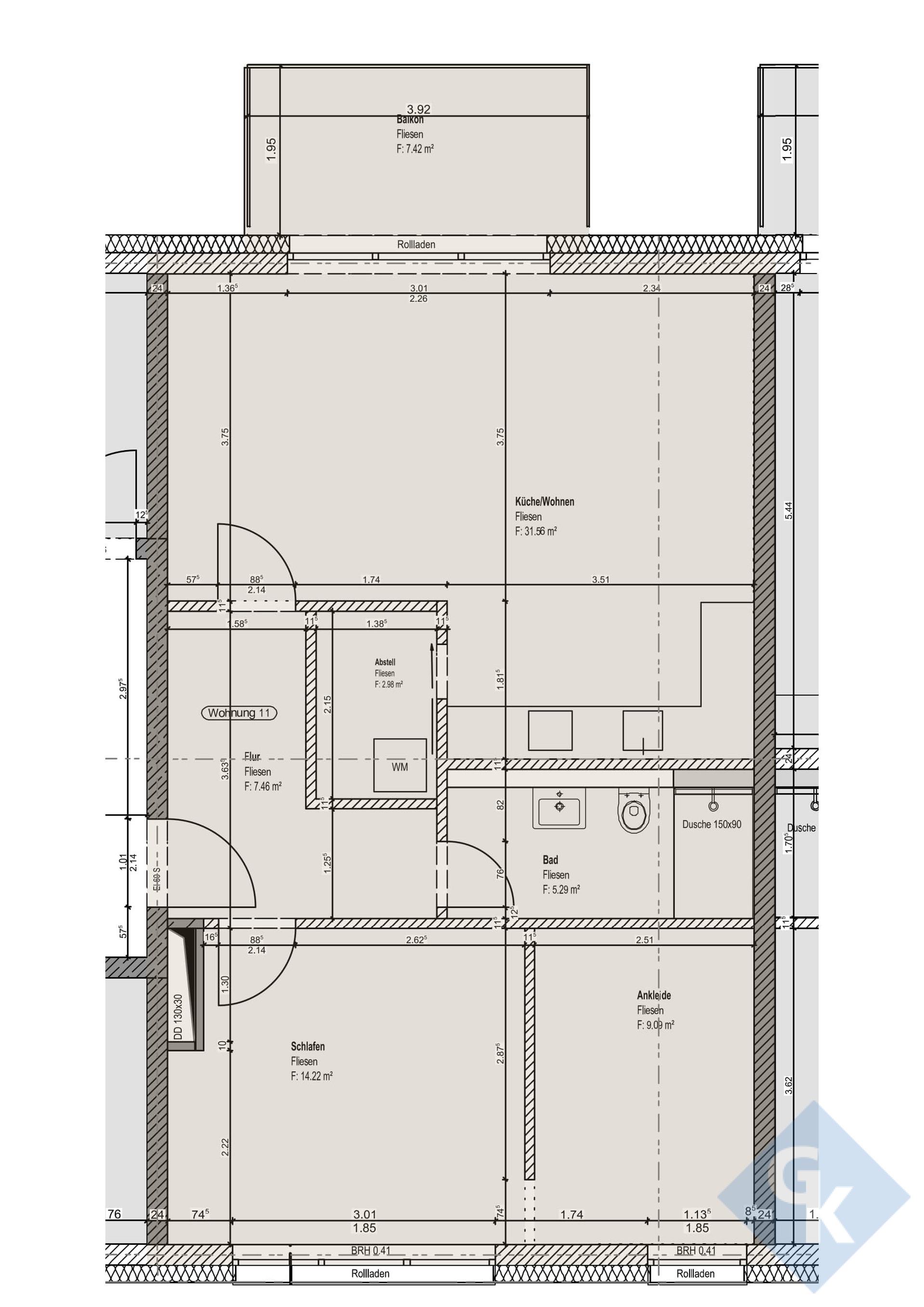 - hall d'entrée (7.46 m²) ; cuisine ouverte sur séjour/salle à manger (31.56 m²) ; débarras (2.98 m²) ; chambre (14.22 m²) ; salle de douche (5.29 m²) ; balcon (7.42 m²).