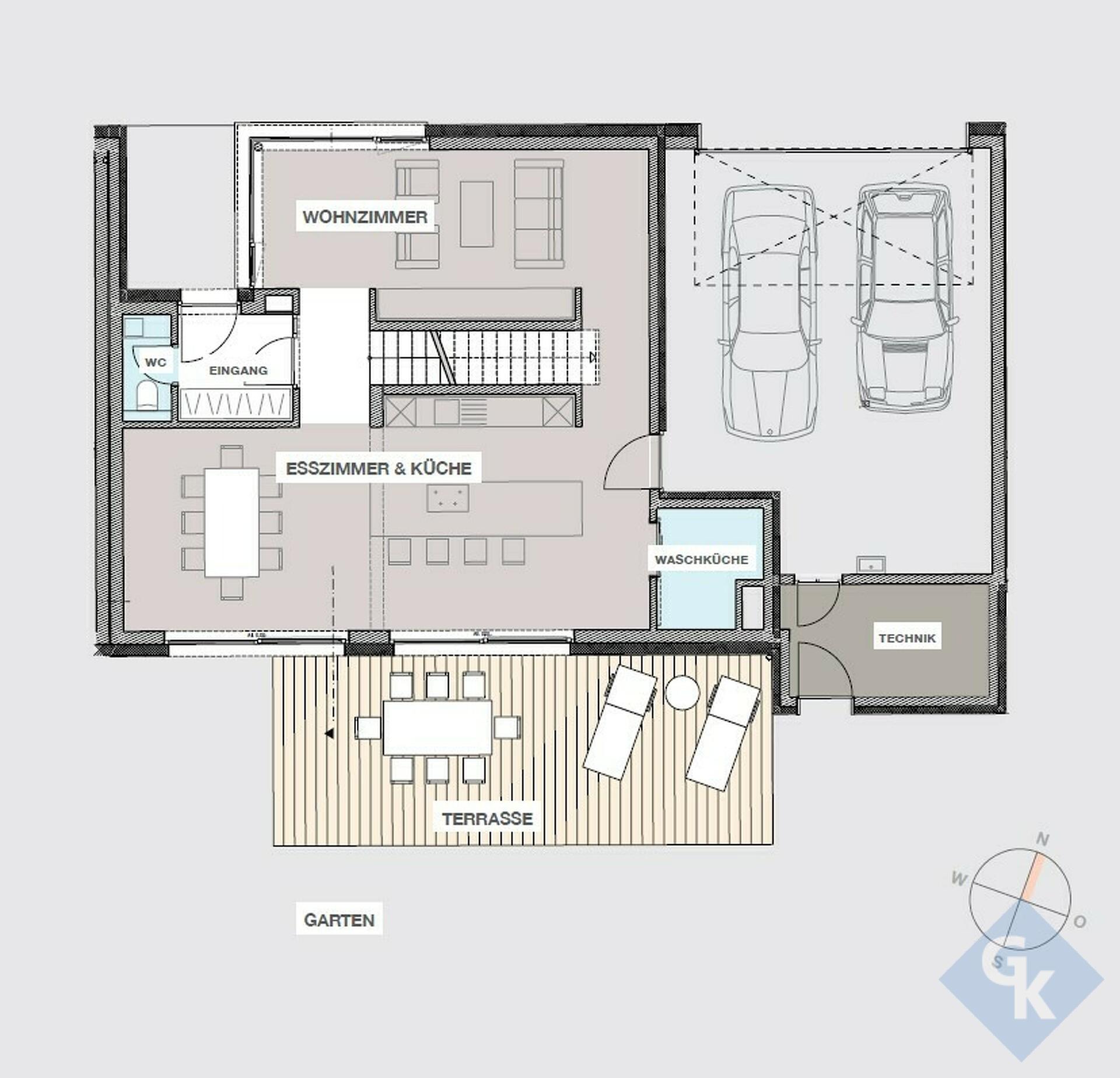 - Au rez-de-chaussée : hall d'entrée – living – cuisine ouverte sur salle à manger – WC séparé – buanderie – local technique – garage pour deux voitures – terrasse et jardin – deux parkings extérieurs
