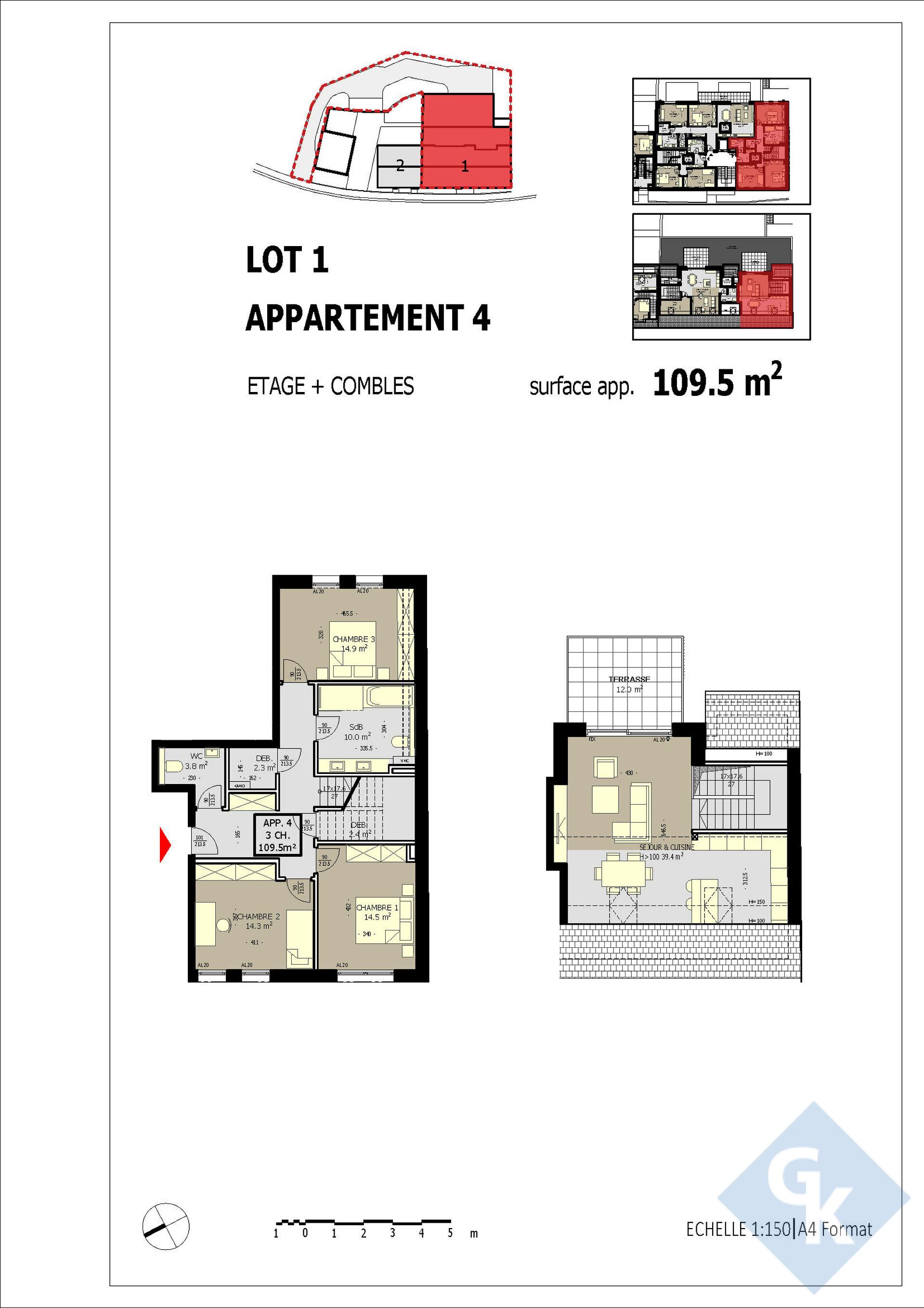 Composition de l'appartement 4 située au 1er & 2e étage de la résidence LOT 1, avec une surface habitable de +- 109.50 m² :