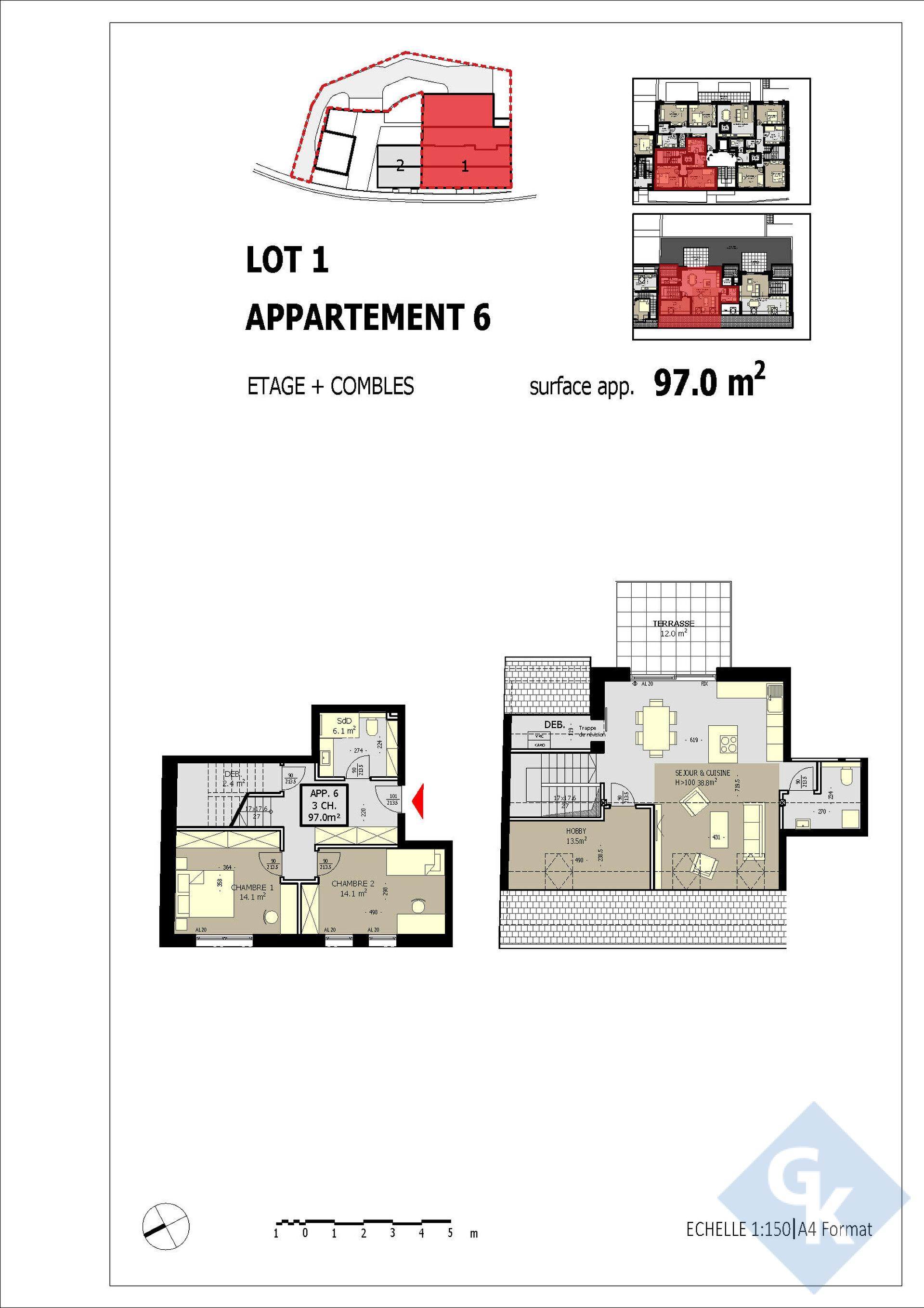 Composition de l'appartement 6 située au 1er & 2e étage de la résidence LOT 1, avec une surface habitable de +- 97.00 m² :