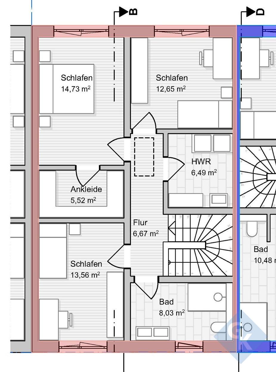 - 2ème étage : hall de nuit (6,67 m²), chambre avec dressing (20,25), deux autres chambres (13,56 et 12,65 m²), salle de bains (8,03 m²), buanderie (6,49 m²)