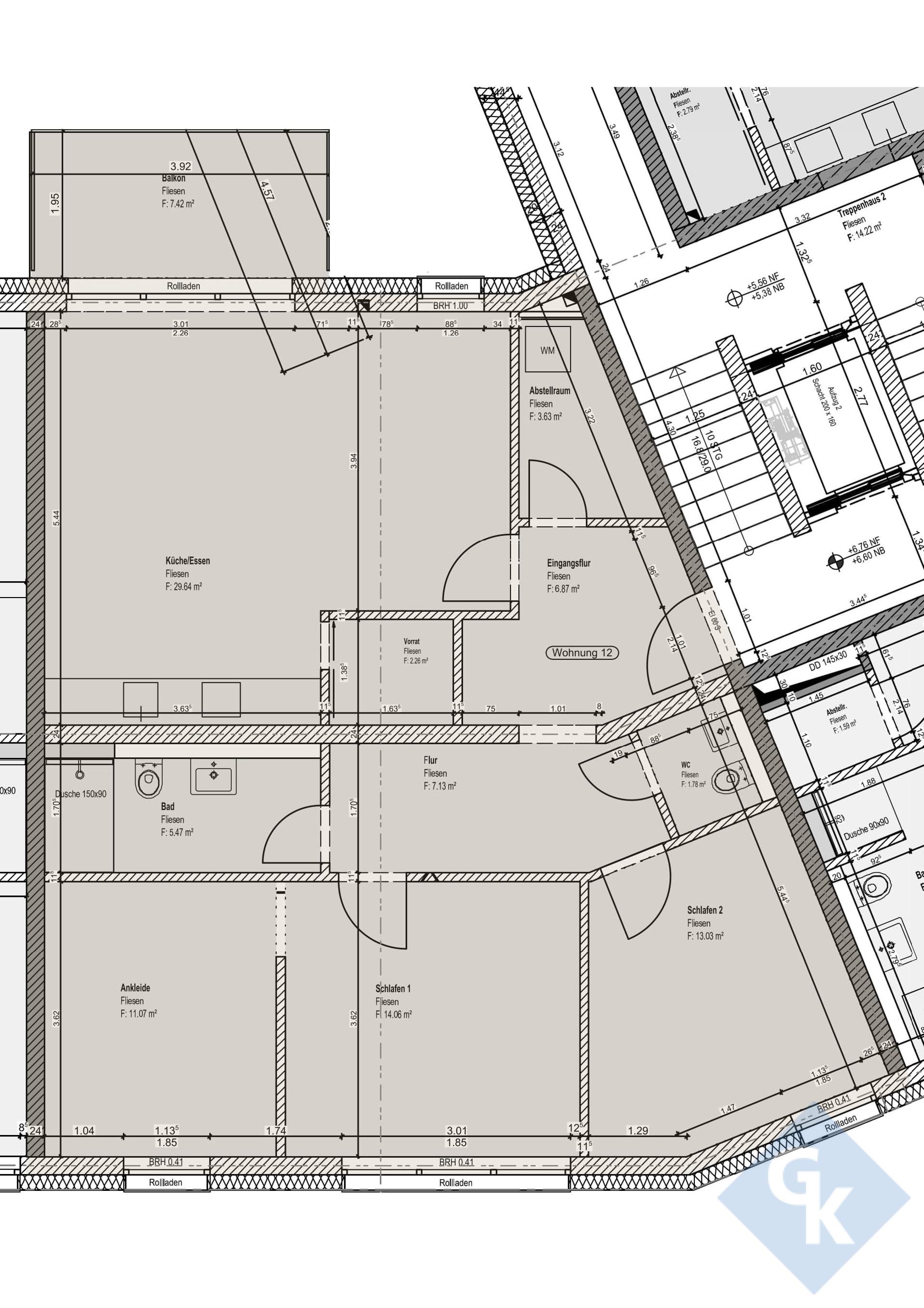 - hall d'entrée (6.87 m²) ; cuisine ouverte sur séjour/salle à manger (29.64 m²) ; débarras (3.63 + 2.26 m²) ; chambre 1 (14.06 m²) ; dressing (11.07 m²) ; chambre 2 (13.03 m²) ; hall (7.13 m²) ; salle de douche (5.47 m²) ; WC séparé (1.78 m²) ; balcon (7.42 m²).