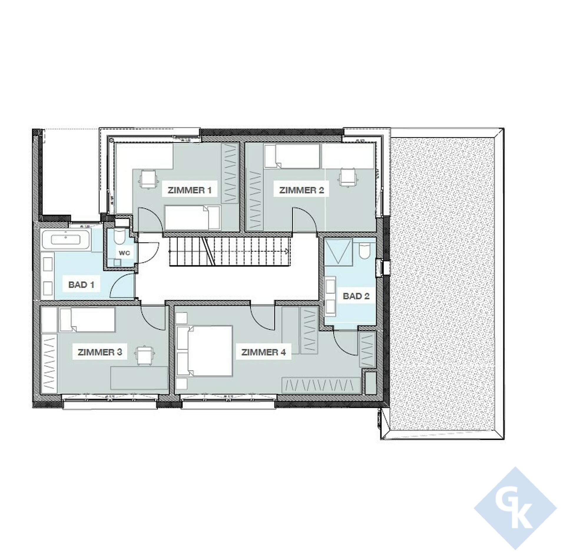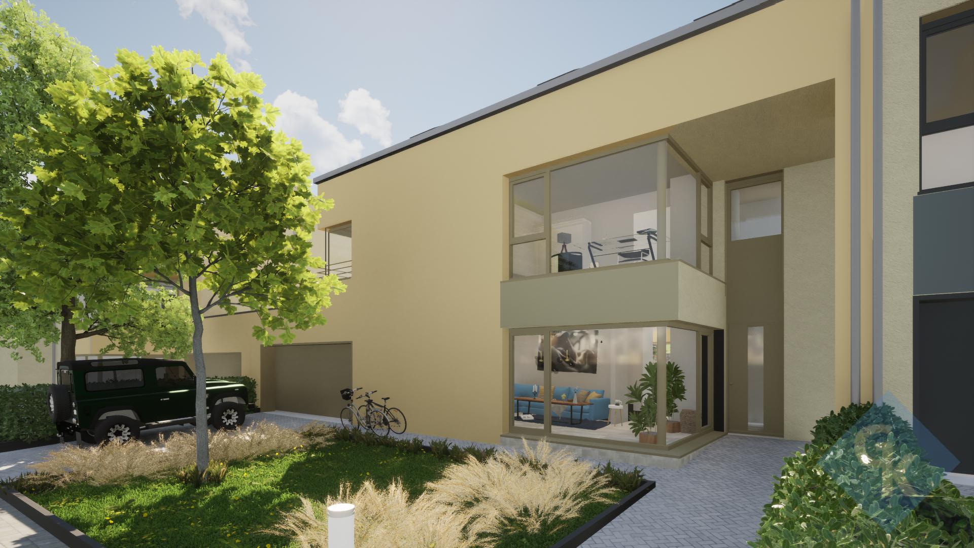 - Au rez-de-chaussée : hall d'entrée – living – cuisine ouverte sur salle à manger – WC séparé – buanderie – local technique – garage pour deux voitures – terrasse et jardin – deux parkings extérieurs