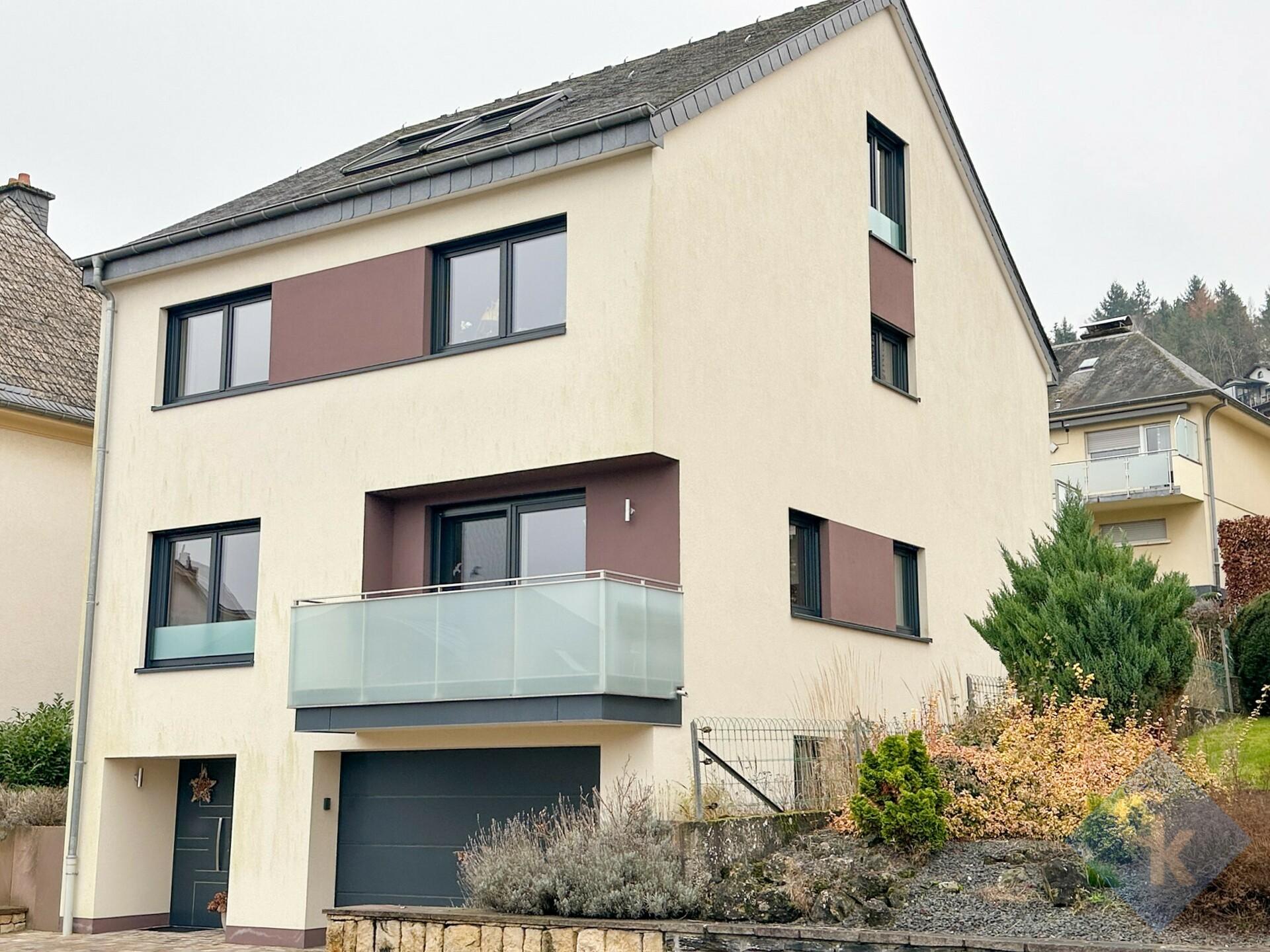 Grande maison en état neuf (2017) libre de 4 côtés sur 4 niveaux - comprenant 5 chambres à coucher; idéal pour une famille nombreuse – ascenseur; 3 terrasses/balcons de 57 m² au total; matériaux de qualité ‘haut de gamme'; les sols sont en grande partie en parquet massif; garage pour 2 voitures et 2 emplacements extérieurs; vue sur le château de Colmar-Berg; situation très calme; à proximité de toutes les commodités du quotidien : commerces, supermarché, écoles, médecins, loisirs divers, A 7 vers Luxembourg-Kirchberg, etc.; à découvrir !