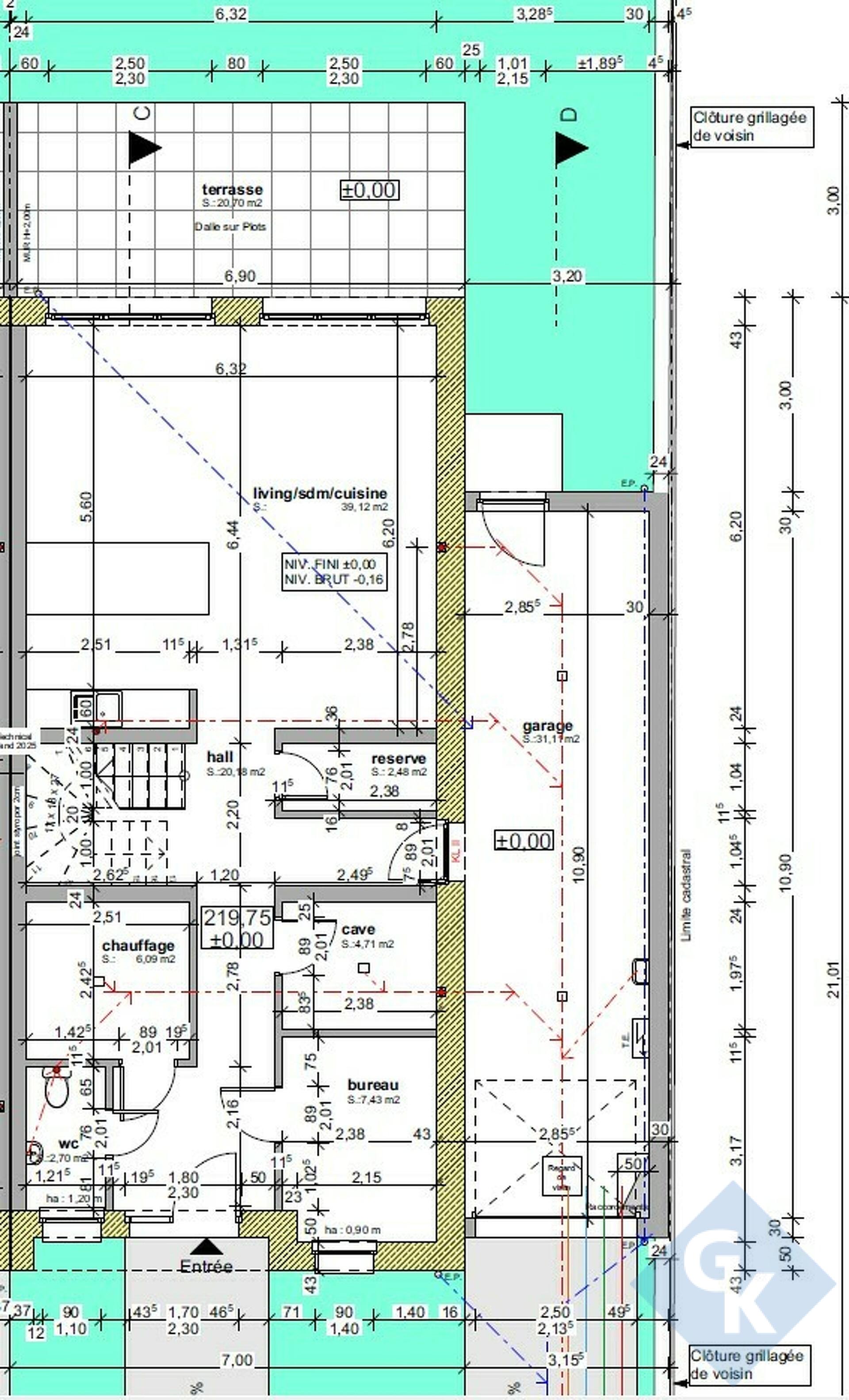 Rez-de-chaussée: hall d'entrée - bureau (7,43m²) - WC séparé - chaufferie - hall d'escalier - réserve - cuisine ouverte sur living et salle à manger (total: 39,12m²) - terrasse (20,70m²) - annexe double garage.