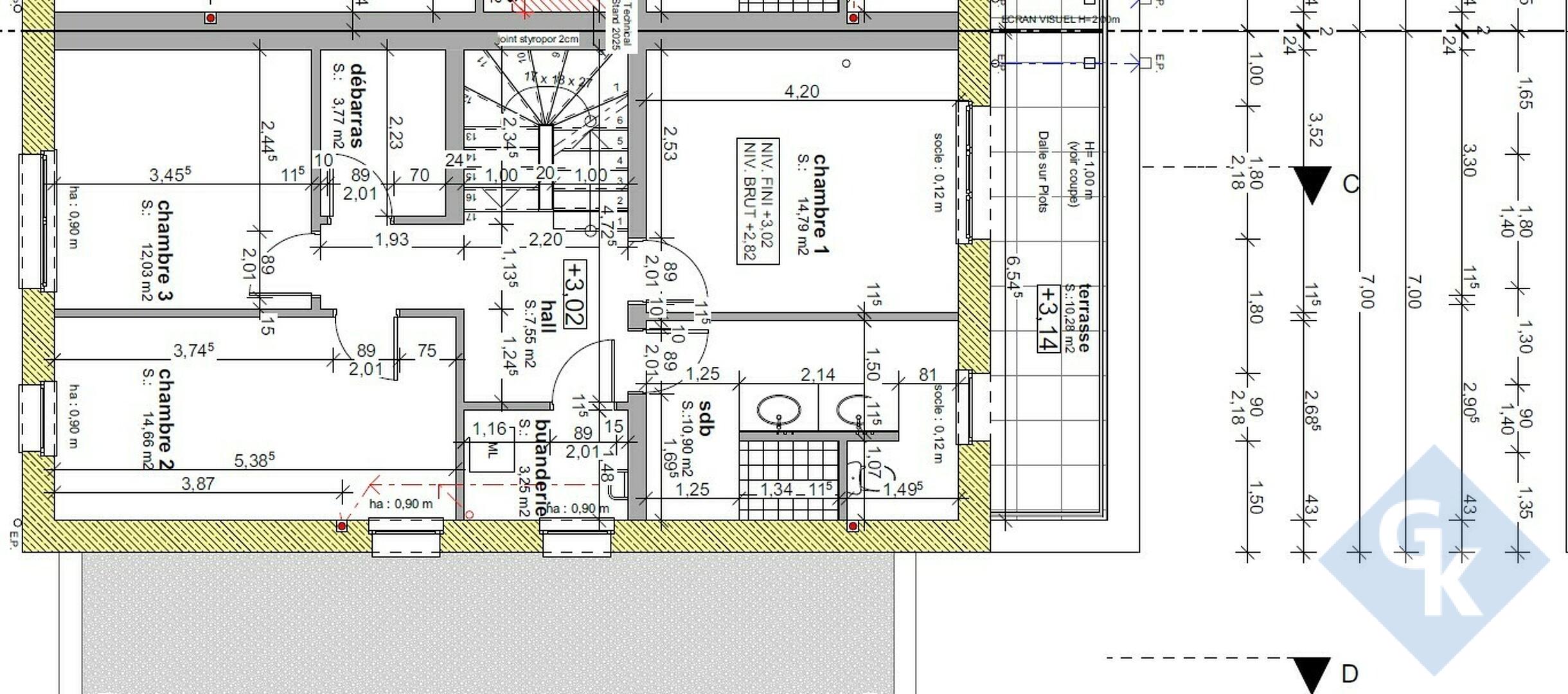 Etage: hall de nuit - chambre 1 (14,79m²) avec terrasse (10,28m²) - chambre 2 (14,66m²) - chambre 3 (12,03m²) - buanderie - salle de bain (10,90m²) avec WC.