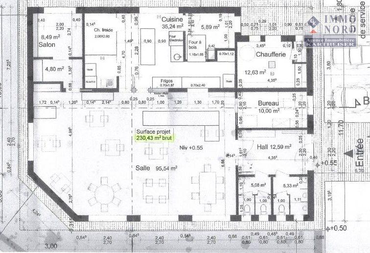 hall d'entrée (12,59 m²); restaurant/salle de service (95,54 m²); cuisine (35,24 m²); arrière cuisine; bureau (10 m²); tract sanitaire hommes et femmes ( 5.08 + 5.33 m²); salon (8.49 m²); chaufferie (12.63 m²) et 14 places de parking.