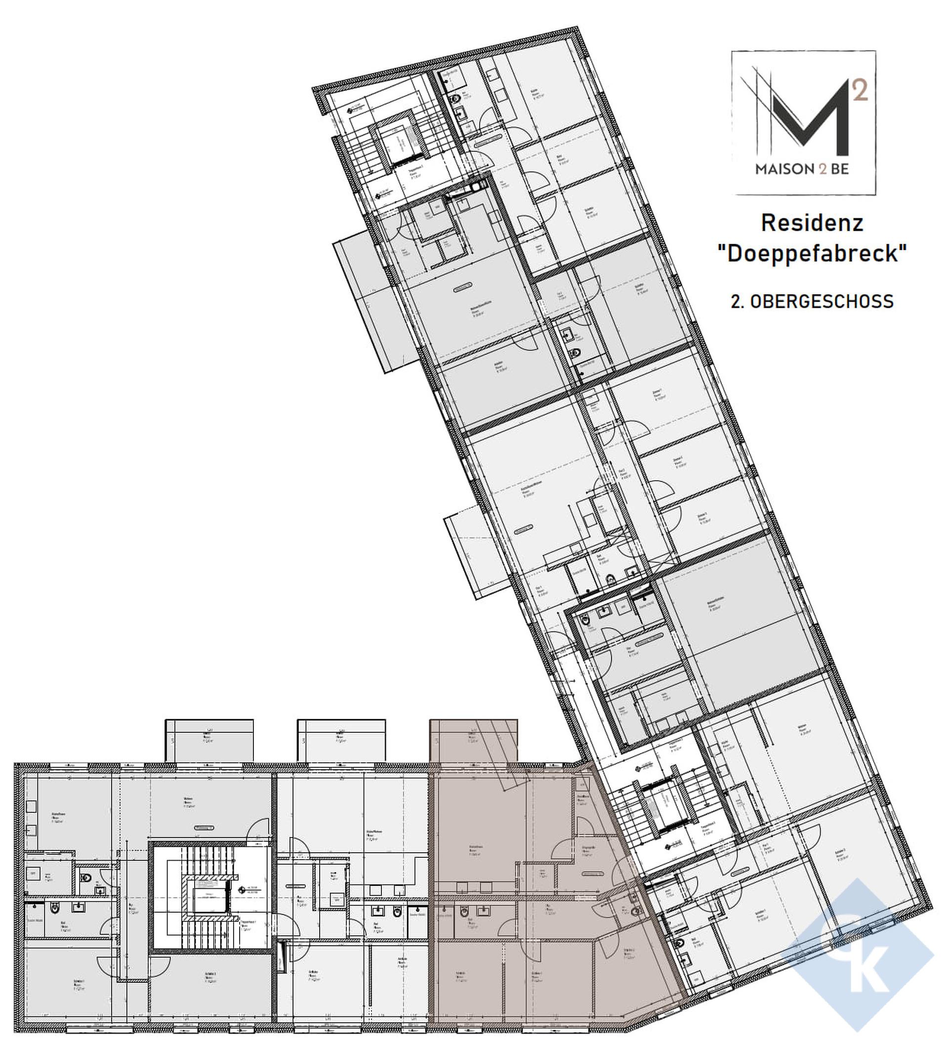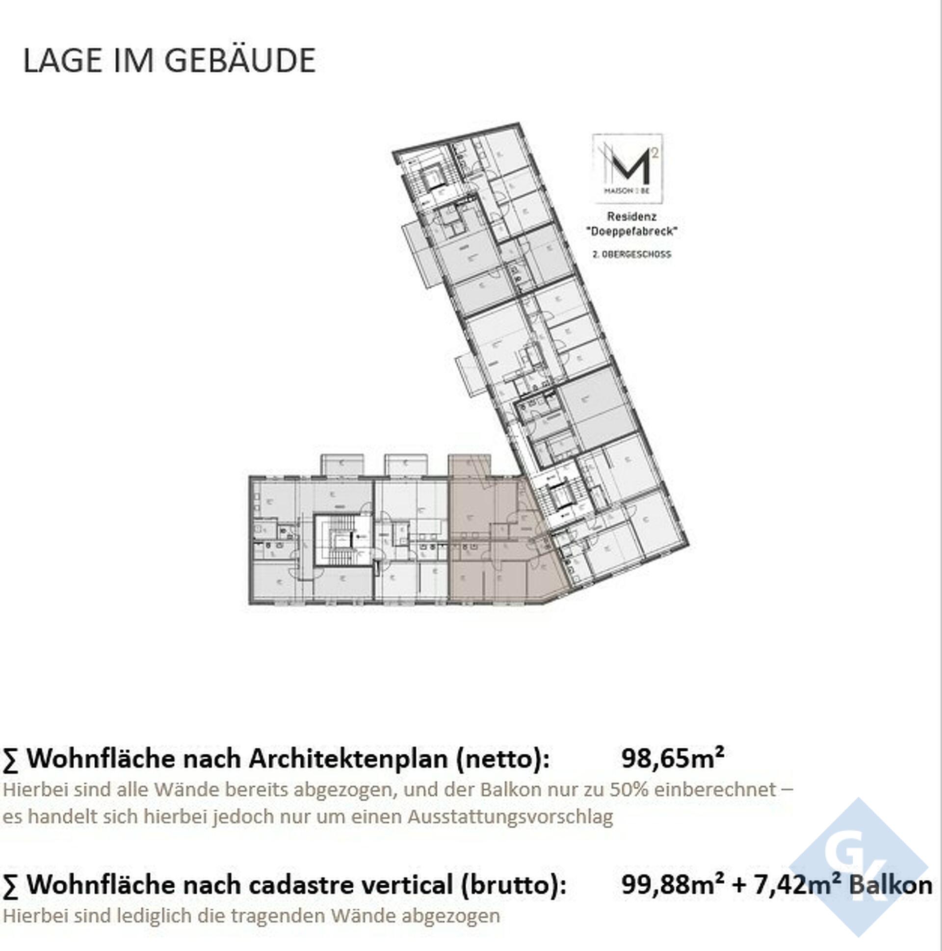 Composition de l'appartement au 2ème étage Lot 111 n°12 de 99.98 m² brute avec un balcon de 7.42 m² et d'une cave de 5.17 m² selon le cadastre vertical et de 98.65 m² selon le plan de l'architecte (tous les murs ont déjà été retirés et le balcon n'est inclus qu'à 50 %) :