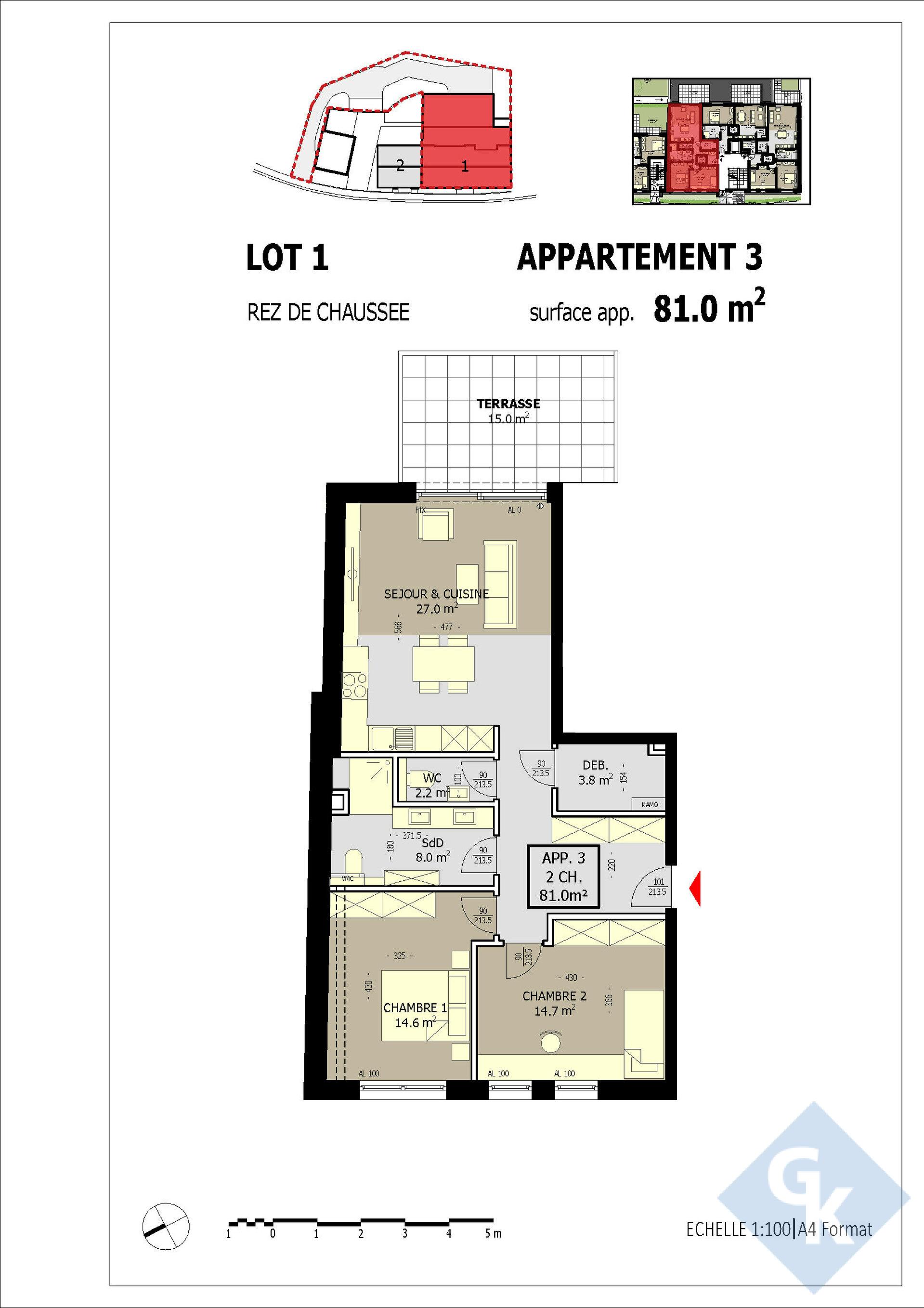 Composition de l'appartement 3 située au rez-de-chaussée de la résidence LOT 1, avec une surface habitable de +- 81.00 m² :