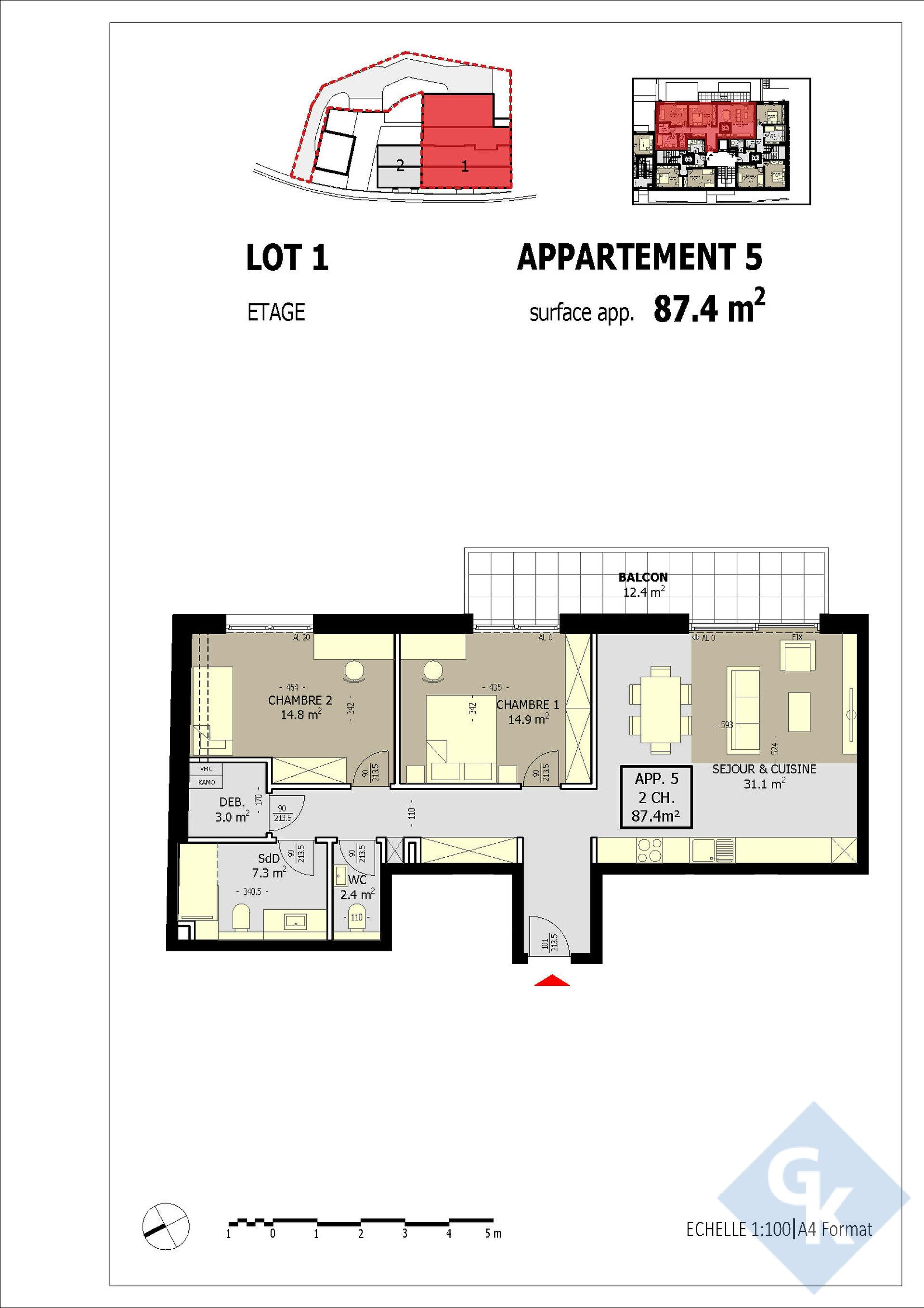 Composition de l'appartement 5 située au 1er étage de la résidence LOT 1, avec une surface habitable de +- 87.40 m² :