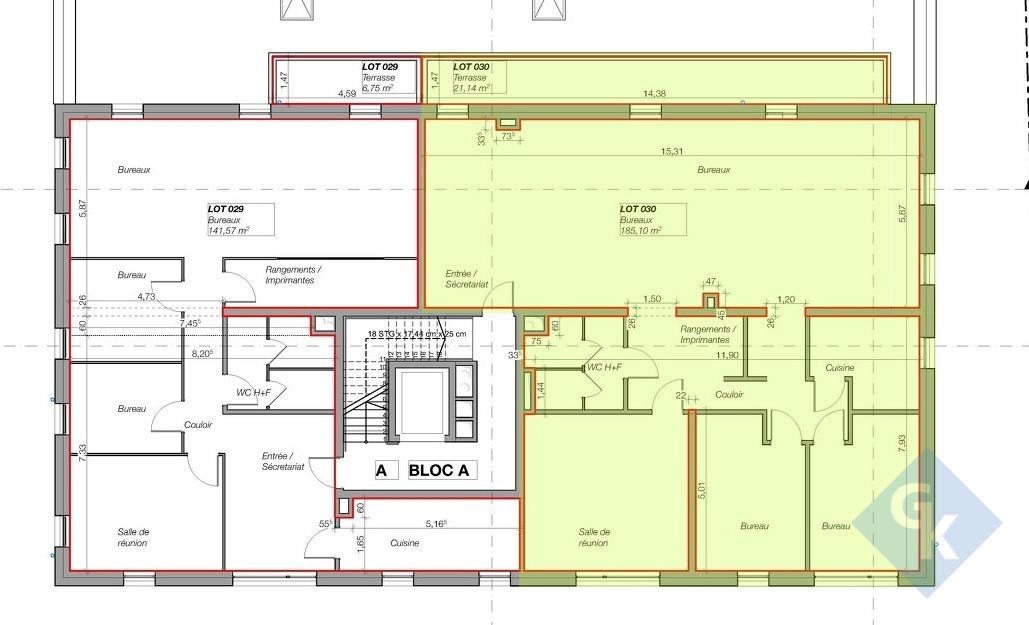 1er étage : entrée/secrétariat, open space (54.88 m²), espace WC (7,42 m²), salle de rangements/imprimantes, cuisine, salle de réunion, bureau 1, bureau 2, terrasse (21.14 m²).