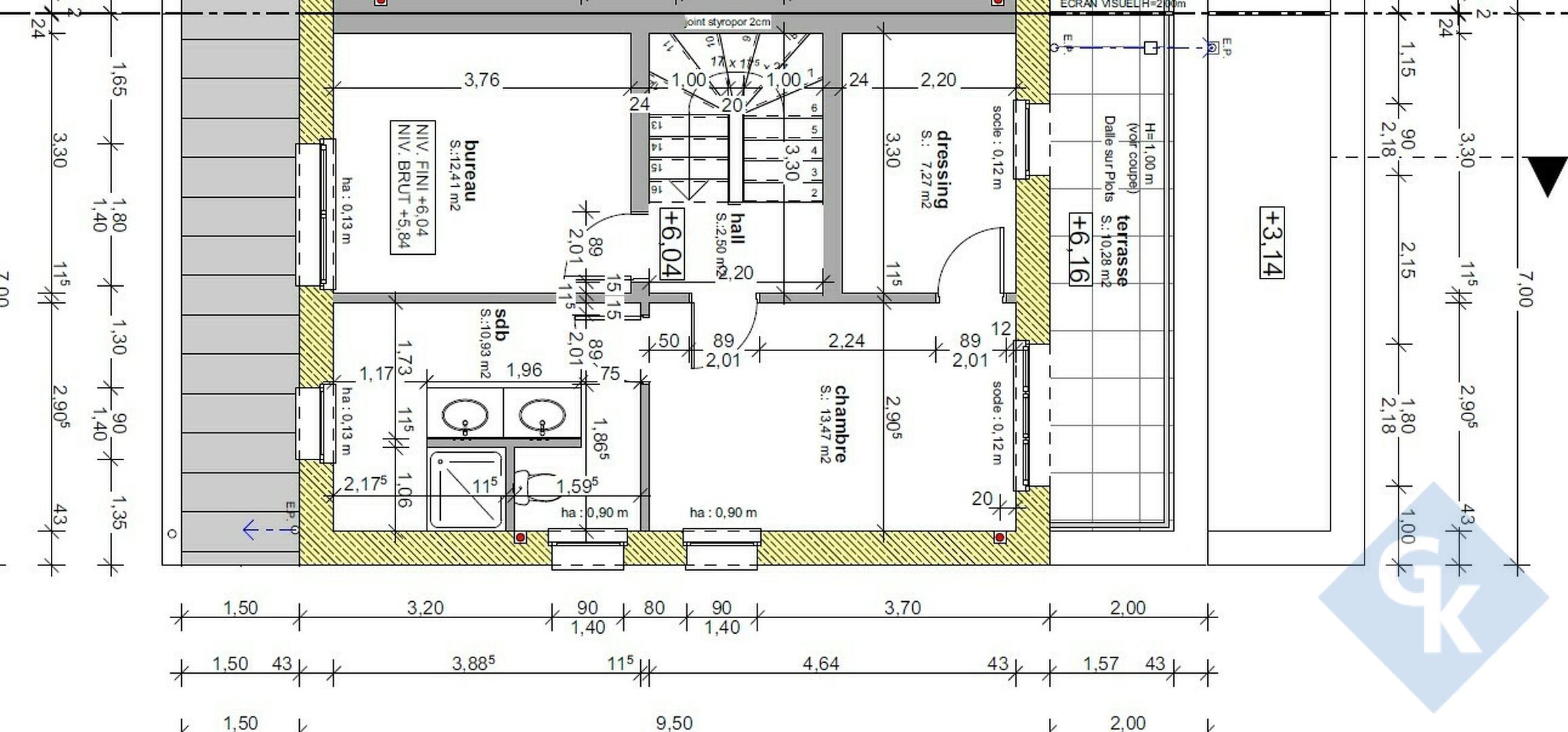 Retrait: hall - bureau (12,41m²) - chambre 4 (13,47 m²) avec dressing (7,27m²) - salle de douche (10,93m²) avec WC - terrasse (10,28m²).